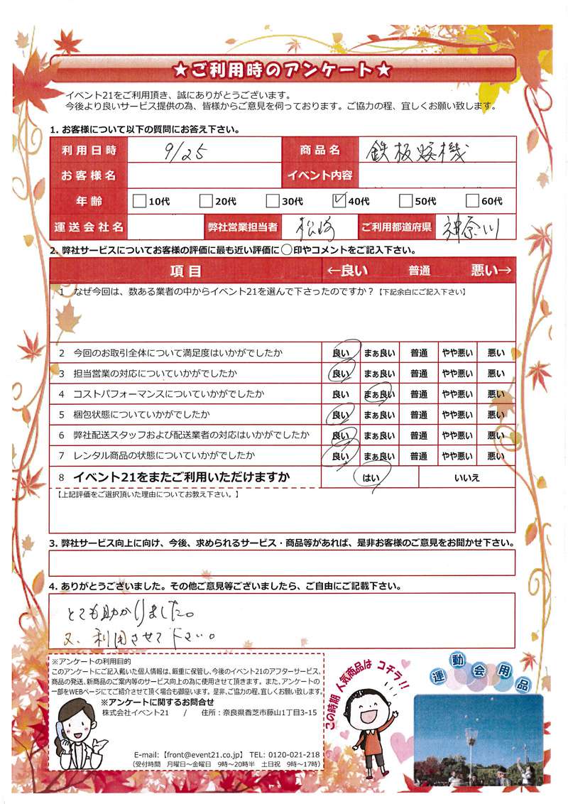 いつもお世話になっております。ご丁寧にメールありがとうございます。この度は天候にも恵まれ、お祭りは大成功したそうです。私どもも鉄板焼き機のおかげでお客様に待ち時間のご迷惑をかける位盛況に終わりました。来年は台数を増やしたいとも考えています。今年もイベント事が数回あると聞いていますのでまたご利用させていただくと思います。その際は宜しく御願い致します。