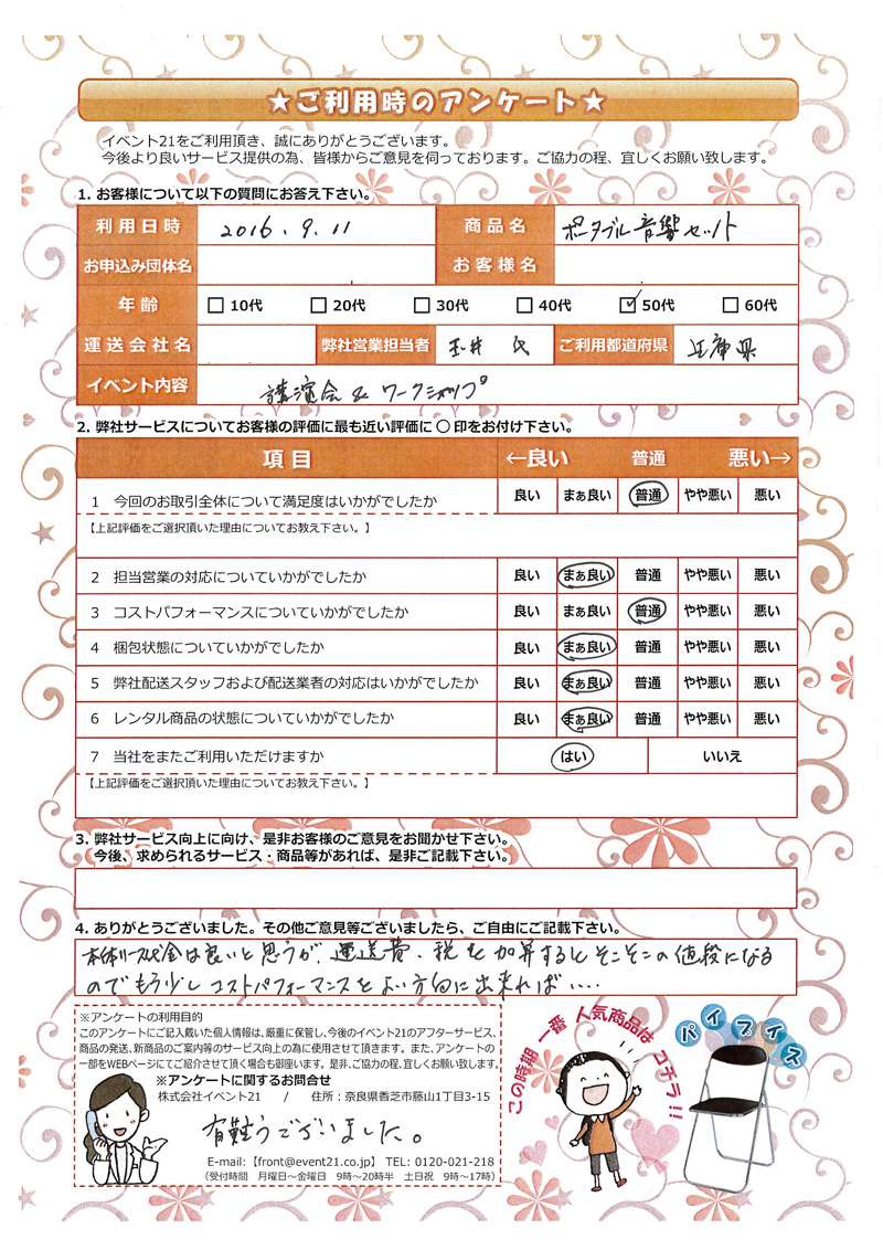 2016年9月にご利用いただいた50代、兵庫県のお客様より。