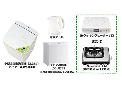 | 備考 | 1ドア冷蔵庫(50L以下)をプラス4,000円で1ドア冷蔵庫(75L以下)に変更できます。 |