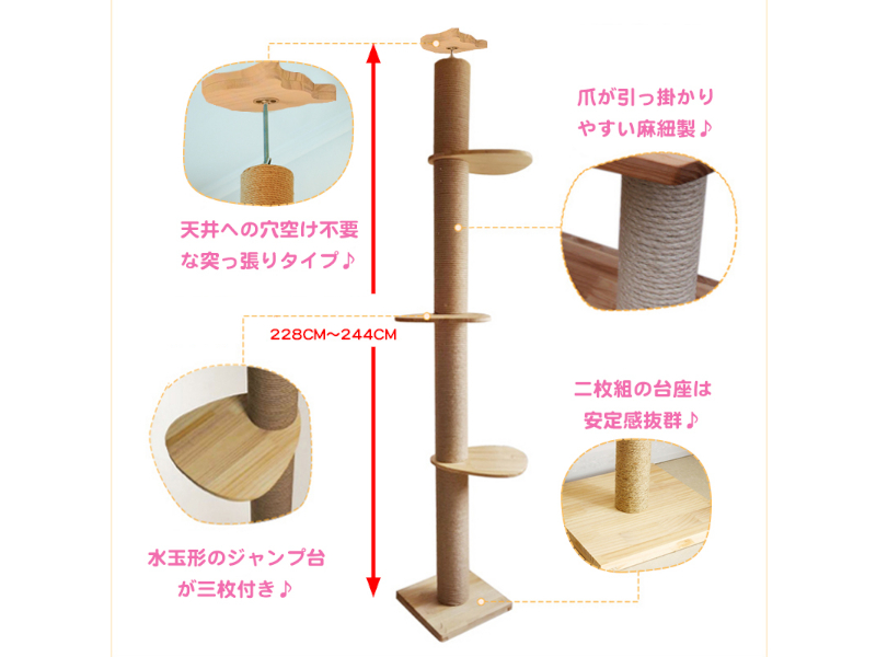 高い所が大好きな猫ちゃんに!「猫ちゃんタワー」のご紹介です。こちらの商品は、天井まで届く巨大なポールで、突っ張り棒のようなかたちで設置できます。支柱は全て麻縄巻きなので、爪とぎも思う存分してもらえ、運動不足やストレス発散にぴったりです!ご自宅はもちろん、猫関連のイベントや猫カフェなどでのご利用などにオススメ。ご入用の際は、お気軽にお問い合わせください!