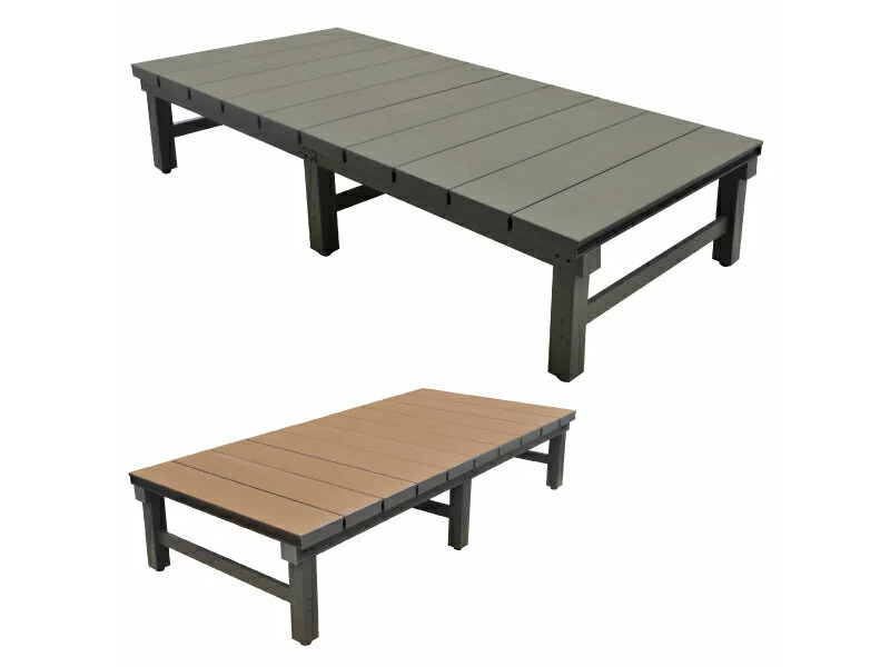 温もり溢れるオシャレな色合いをした、ガーデンウッドデッキのご紹介です。天板は人工木を使用しているため害虫被害が少なく、土台部分は腐食に強いアルミ材を使用しております。組み立ては付属のスパナで簡単に行えるので、初心者の方も安心ですよ!また、アジャスターを回すと高さ調節が できる他、付属の連結プレートを使用して複数台同じ商品を連結することも可能です。カラーはブラウン、アッシュブラウンの2色ございますので、お庭の雰囲気に合わせてお選び下さい。