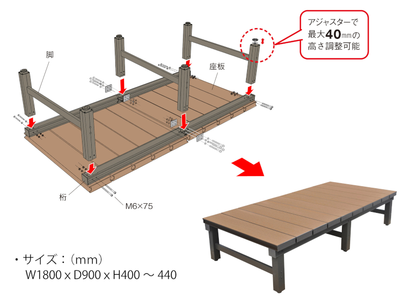 幅 1,800×奥 900×高 400〜440mm |