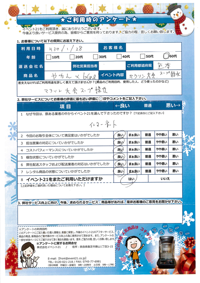 - 全く問題ありませんでした、来年も同時期に予定しておりますのでお願いしたいと思います。