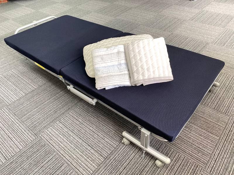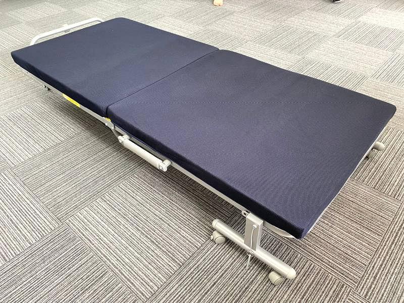 医療現場などでベッドが足りなくなった時などにお使い頂ける、救護ベッドのご紹介です。こちらは幅910mm、奥行きが2,010mmとかなりの大きさをしています。で通気性の良いメッシュ生地を使用しており、そのままでも、シーツなどを敷いてもお使い頂けます。キャスター付きなので女性の方でも簡単に移動できる他、使わない時は折りたためるので置き場に困りません。病院や介護施設、保健室をはじめ、イベント会場にちょっとした救護スペースを設けたい時などに簡易ベッドとしてお使いいただけますので、是非いかがでしょうか。