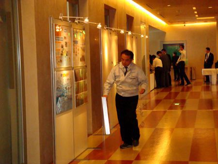 スタンド設置で自立も出来板面がハードなので綺麗なパネルパーテーション レンタルのご紹介です!マグネット式の支柱で組み立て自立が簡単!上部連結部にはパーツを差し込むだけで連結可能で便利です!素材面がハード加工なので画鋲は使用できませんが展示用フックなどを使って額縁の展示などが可能です!