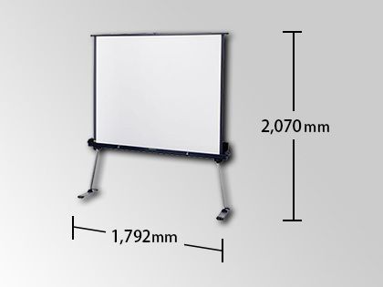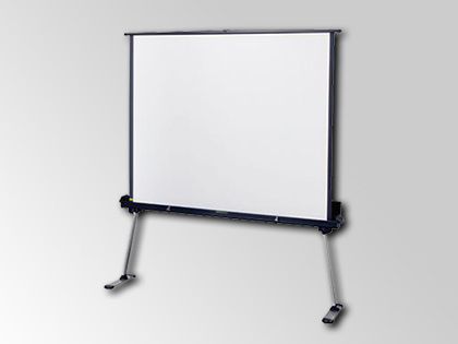 予めスタンドがついているスクリーンのご紹介です。通常スクリーンといえば、会場に備え付けで天井にロール式に収納されているタイプが多いですが、こちらのスタンド式スクリーンは、折りたたみもでき邪魔になりません。スクリーンは椅子に座った状態で視聴するのに最適な高さになっています。会議やプレゼンテーションで、備え付けのスクリーンがない会場を使用する場合にお勧めです。
