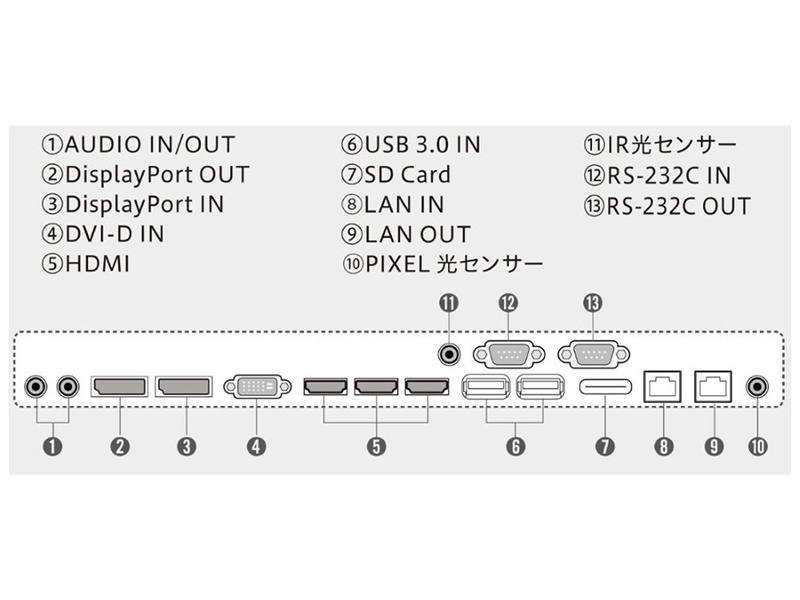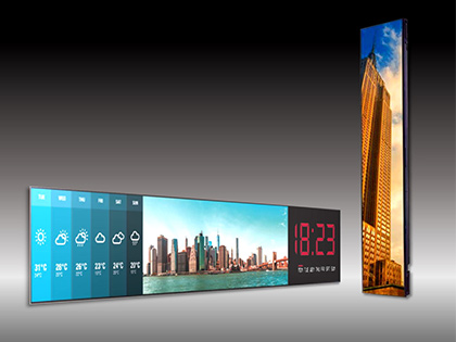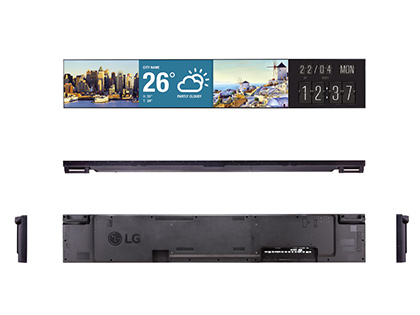 58:9のダイナミックなコンテンツを表現した超横長で大画面の「ウルトラストレッチサイネージ」のご紹介です。 Picture by Pictureで2分割、3分割、4分割の表示をすることができます。縦でも横でも使用することができますので 場所を選ぶ事なく多様な用途にあわせて適応することが可能です。 複数の機器を接続する方法のひとつで、数珠繋ぎにつないでいくLANデイジーチェーンに対応し、表示されたコンテンツやレイアウ ト等をパソコンで操作することができます。