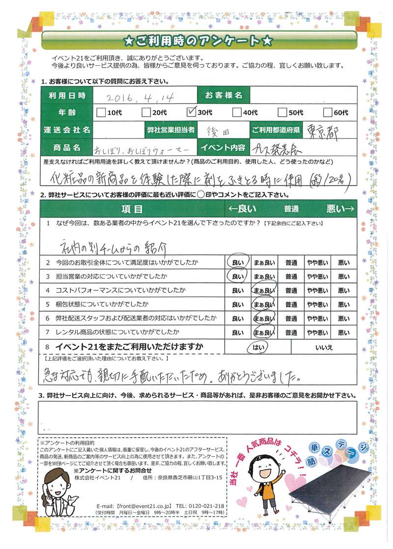 2016年4月にご利用いただいた30代、東京都のお客様より。