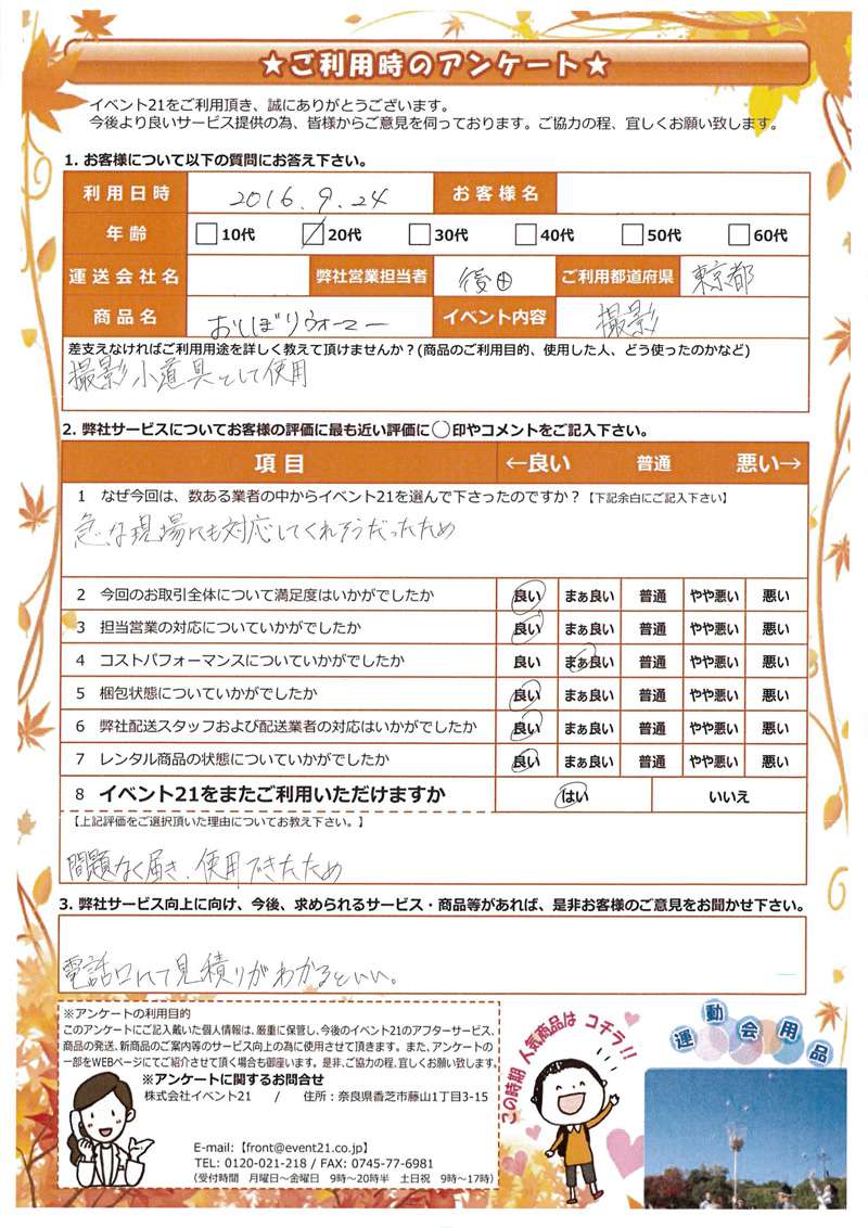 2016年9月にご利用いただいた20代、東京都のお客様より。