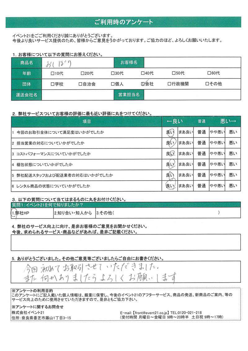 - 弊社サービス向上に向け、是非お客様のご意見をお聞かせ下さい。今後求められるサービス・商品名等があれば、是非ご記入下さい。