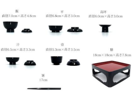 | サイズ | 6.0寸 ◆膳:幅18cm×奥行18cm×高さ7.8cm ◆飯:直径7.0cm×高さ4.8cm ◆汁:直径6.5cm×高さ3.3cm ◆平:直径6.8cm×高さ3.0cm ◆壺:直径5.3cm×高さ3.5cm ◆高坏:直径6.0cm×高さ3.5cm ◆箸:長さ17cm |