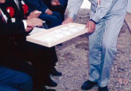 - 神事式次第の神酒拝戴は、かわらけに神酒を宮司様から注いでいただいて乾杯します。この時参列者は全員起立で宮司様の御発声により乾杯します。