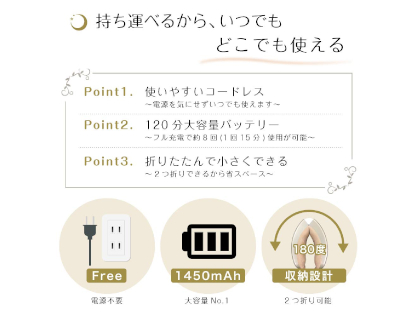 - A.本製品は指圧をかけたり振動をあてるものですので、お化粧が取れてしまう恐れがあります。そのため、お手数ですが予めメイクを落とした状態でお使いください。