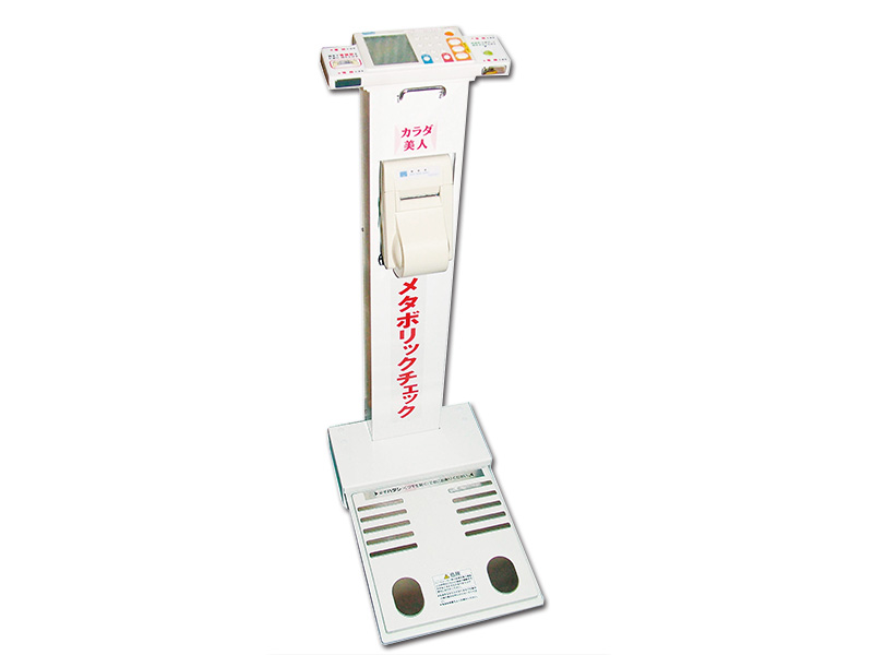 生活習慣病の予防に!身体をまるごとチェックできる「メタボリックチェッカー」のご紹介です。年齢、身長、ウエスト、性別を入力して裸足で乗っていただくと、約2分ほどで体脂肪率、内臓脂肪率、筋肉量、推定骨量、水分量、基礎代謝量、BIM肥満度、体重、以上8項目がチェックできます。結果はレシート状にプリントアウトされますので、じっくりとご自分の体の状態を確認していただけます。健康イベントやスポーツイベントに是非ご利用ください!