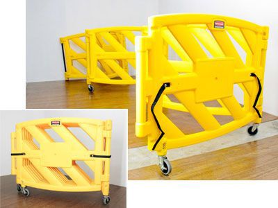 イエローの外観が特徴的で6枚のフェンスが連結された形状になっている移動式折り畳みフェンスのご紹介です。フェンス下にはキャスターが付いており、折りたたんだ状態や広げた状態からの移動もしやすくなっております。使うときと使わないときで収納がしやすくなっておりますので取り扱いが簡単になっております。