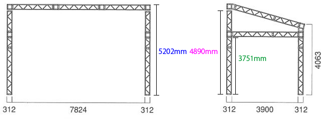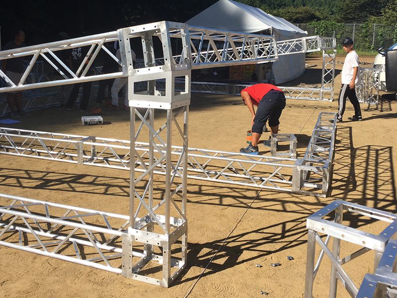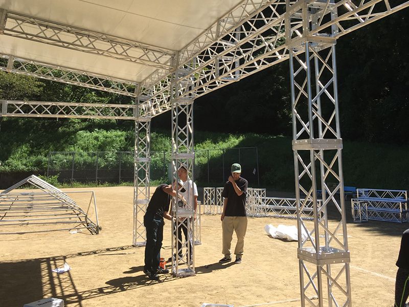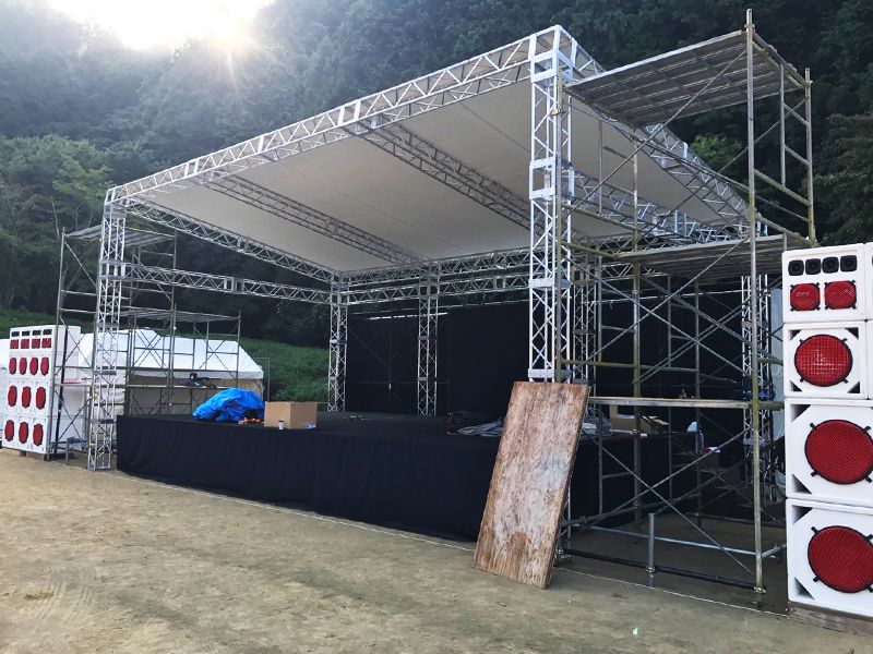 野外でステージを設営する際に使われる日よけ雨避けようのアルミトラステント レンタルのご紹介です。アルミトラステントを使った骨組みをテント上に組み、ステージをつけてステージテントとしてお使いいただきます。また舞台を照らすライトなども設置できます!サイズは4種類ほどございますので会場規模やイベント規模によってお選びください。