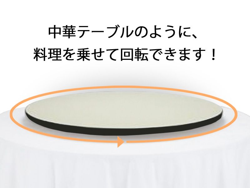 パーティーや宴会などにお使いいただける卓上回転台のご紹介です。この卓上回転台はテーブルの上に乗せるだけなので、取り付け器具が必要無く設営に手間がかかりません。テーブルクロスや普段お使いのテーブルと一緒にセッティングすることでその場がパーティー会場の華やかな雰囲気へと早変わりします。また、台が回転するのでビュッフェパーティやビアガーデンなどでもお手軽に食事を楽しむことができます。