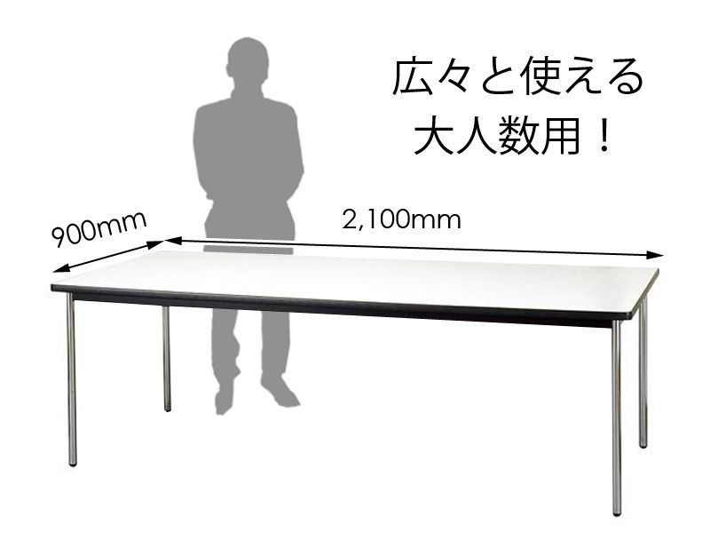 大勢で行われるミーティングや研修会、役員会議など、様々な会議シーンに対応する大型ミーティングテーブルのご紹介です。幅が約2,100oで大人の男性が余裕を持って3名ずつ、合わせて6名お座りいただけるサイズ感です。天板が白色に近いアイボリーですので圧迫感が無く、清潔感のある雰囲気作りができます。会議などだけではなく、展示会や催事イベントでの展示台としてもお勧めです!
