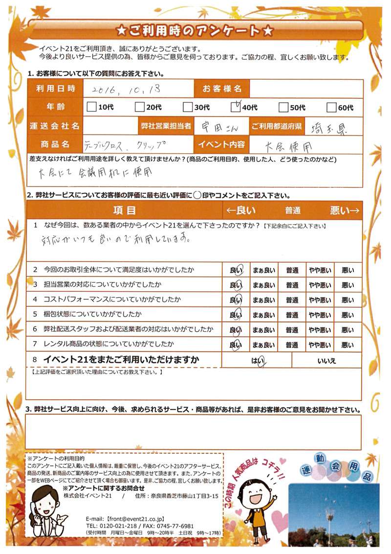 2016年10月にご利用いただいた40代、埼玉県のお客様より。