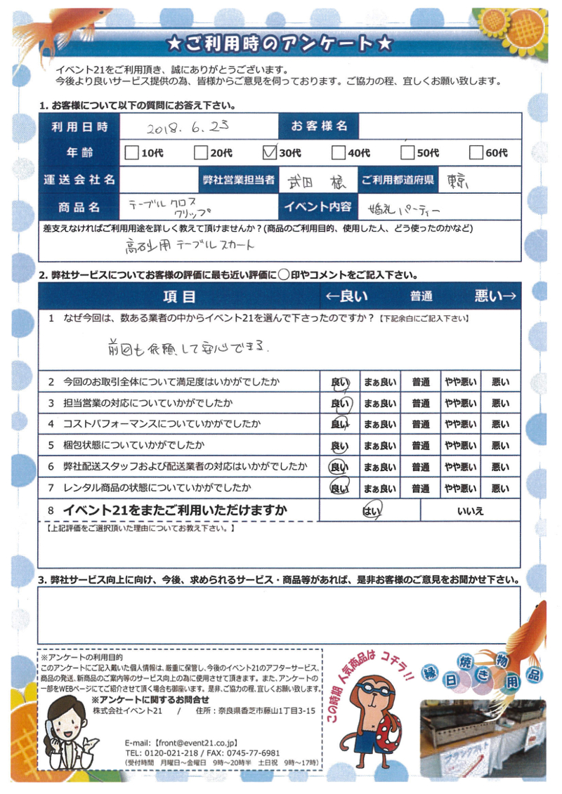 この度は弊社をご利用いただき誠にありがとうございます。ぜひまたご入用の際はお気軽にお問い合わせください。