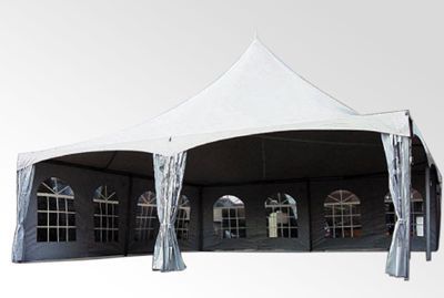 半円形の窓が付いたオシャレな白テントです。大きさは9m×9mで大型のものとなっています。窓が開いているため、照明を使わなくても窓から日光を取り込むことが出来ます。横幕は窓付きと窓なしの二種類です。テントでありながら窓がついていて、屋根が尖っている個性的なデザイン。展示会や露店、休憩所などを設営する際にご検討ください!