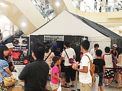 夏になると涼しい体験がしたくなる人は多いものです。夏場のイベントにお勧めのホラーハウスのご紹介です。3間×5間のテントが建てられるスペースがあれば、簡単に設置できます。しかもテント内を6種類のお化け登場シーンに区切ることができます。ヒヤっとするようなホラー体験をしたい時にはお客様に動きに合わせてお化け役が驚かしたり、弊社で取り扱いのミスト扇風機も効果的です。