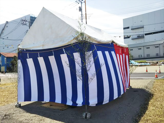 今回は埼玉県にて起工式を行いました。テントの周りを青白の幕で囲い神事で使用する物品も手配いたしました。弊社では地鎮祭や竣工式などの式典の設営も行っております。 様々な分野のイベントの設営撤去などを行っているので、ぜひお気軽にお問い合わせください。イベントの企画や運営もお任せください!