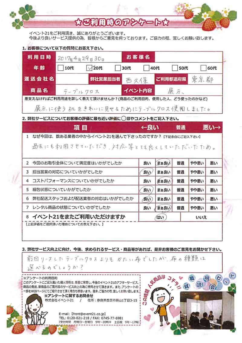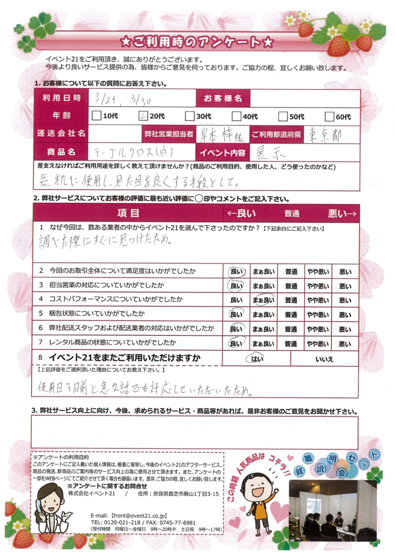 この度は弊社のテーブルクロスをレンタルしていただきありがとうございました。