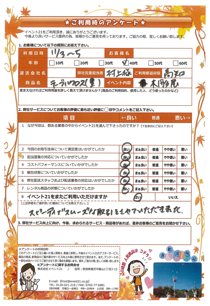 この度は弊社をご利用頂きましてありがとうございました。無事イベントが成功されたようで私自身も嬉しく感じております。また機会がございましたら是非ご相談ください。ありがとうございます!